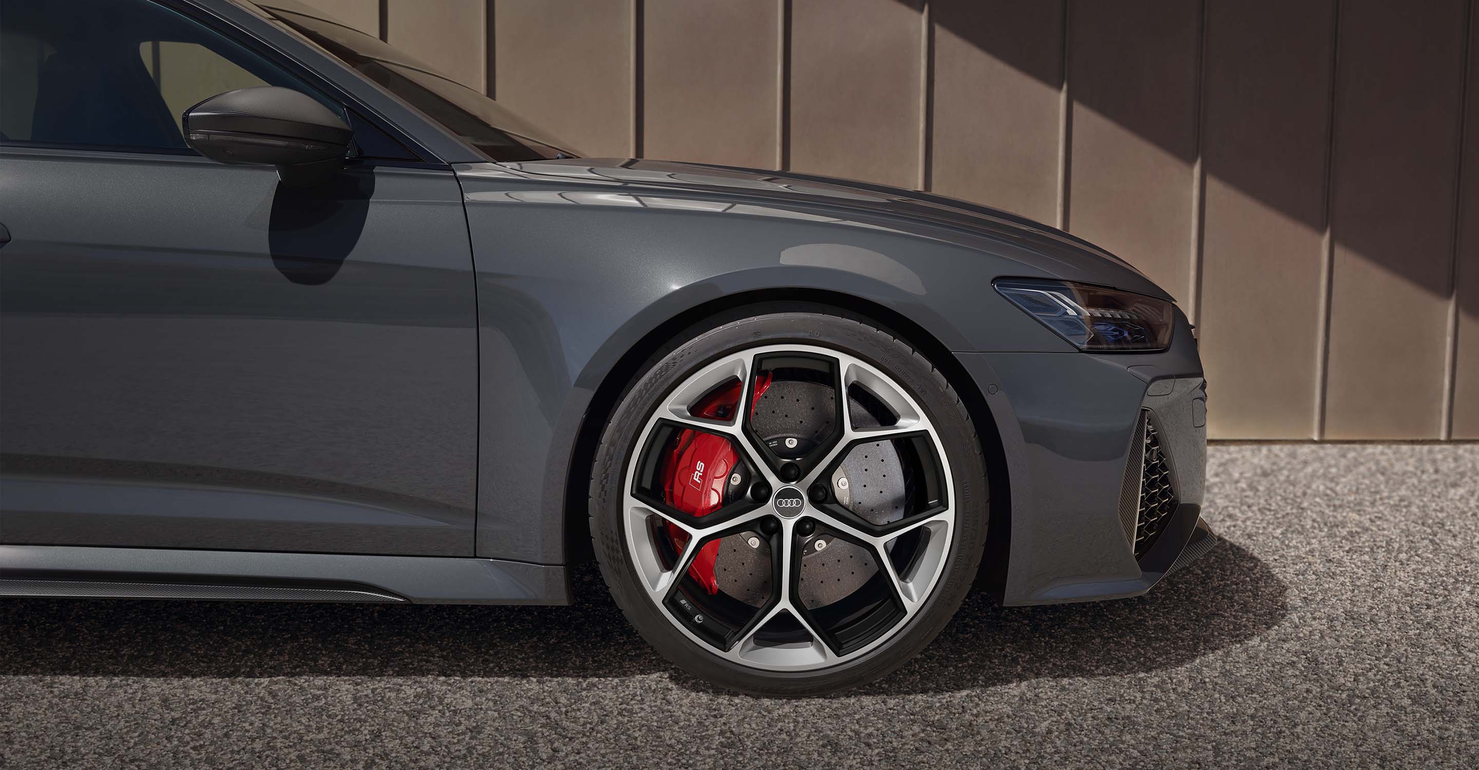 Its front wheels use Brembo eight-piston monolithic brake calipers, each with four pads and radially ventilated brake discs, with a diameter of 365 mm and a thickness of 33 mm. The tail uses a single-piston ATE brake caliper with a floating radial vent disc, with a diameter of 335 mm and a thickness of 23 mm. The front and rear brake calipers are made of a high gloss material and have the Audi "RS" logo in black paint.