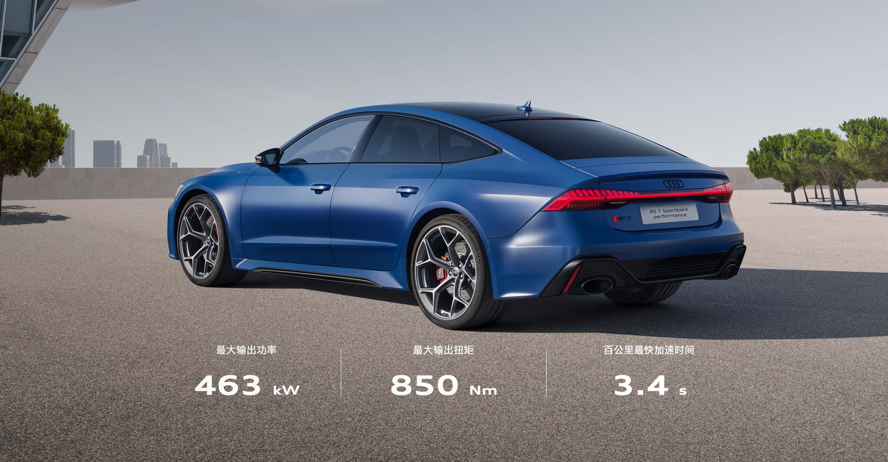 The Audi RS7 is powered by a 4.0 TFSIV8 twin-turbocharged direct injection engine with a maximum power of 412 kW and a maximum torque of 700 nm. It is matched by an 8-speed manual all-in-one transmission, as well as a quattro all-wheel-drive system. The 0-100km/h acceleration is only 3.9 seconds.