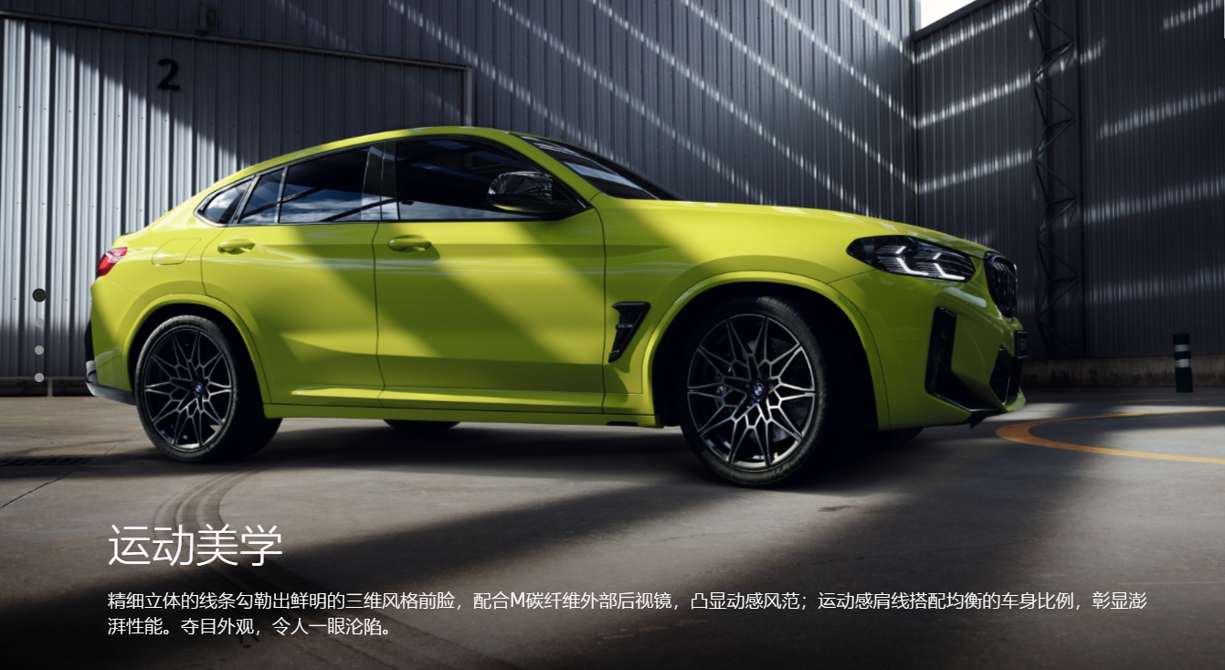 When you crave a fierce driving machine that resonates aesthetically, the BMW X4 M is the answer. With exquisite aesthetic design, combined with cross-country and sports talent, it creates a unique style of elegance and toughness. The flamboyant tail shape and smooth coupe style roof show a breathtaking dynamic charm. The use of 21-inch aluminum alloy rims and carbon fiber trim gives the details a sense of power and luxury.。