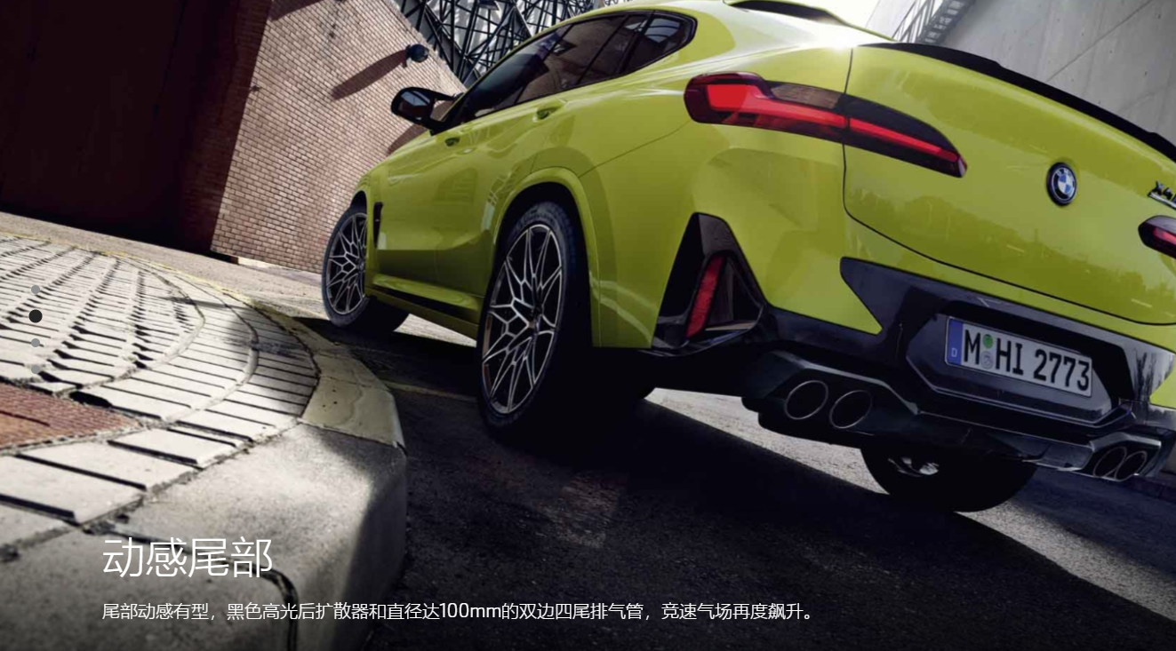 The BMW X4M is equipped with a high speed 3.0L twin turbocharged direct injection engine, the ordinary version can burst 353kW/480ps power output, 0-100 km/h acceleration time of 4.2 seconds; The Thunder version can burst 375kW/510ps of power output, peak torque of 600 N · m, 0-100 km/h acceleration in just 4.1 seconds. In terms of chassis configuration, BMW X4M adopts double ball joint spring shock pillar front suspension + five-link rear suspension, both with lateral stabilizer bar structure, strong chassis.
