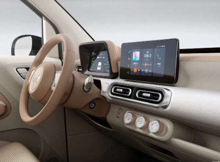 The new Hongguang MINIEV Macaron continues to apply SMILEY aesthetics in the interior design, and has also been comprehensively upgraded in many aspects such as space performance, seat material, and cabin configuration. Specifically, the car uses the classic two-spoke multi-function steering wheel design (integrated audio control, phone answering and switching songs, including a variety of function buttons), coupled with a new shape of the large LCD meter and 8-inch suspension center screen, providing high-definition reverse video. In addition, the car will also support mobile App remote connectivity.